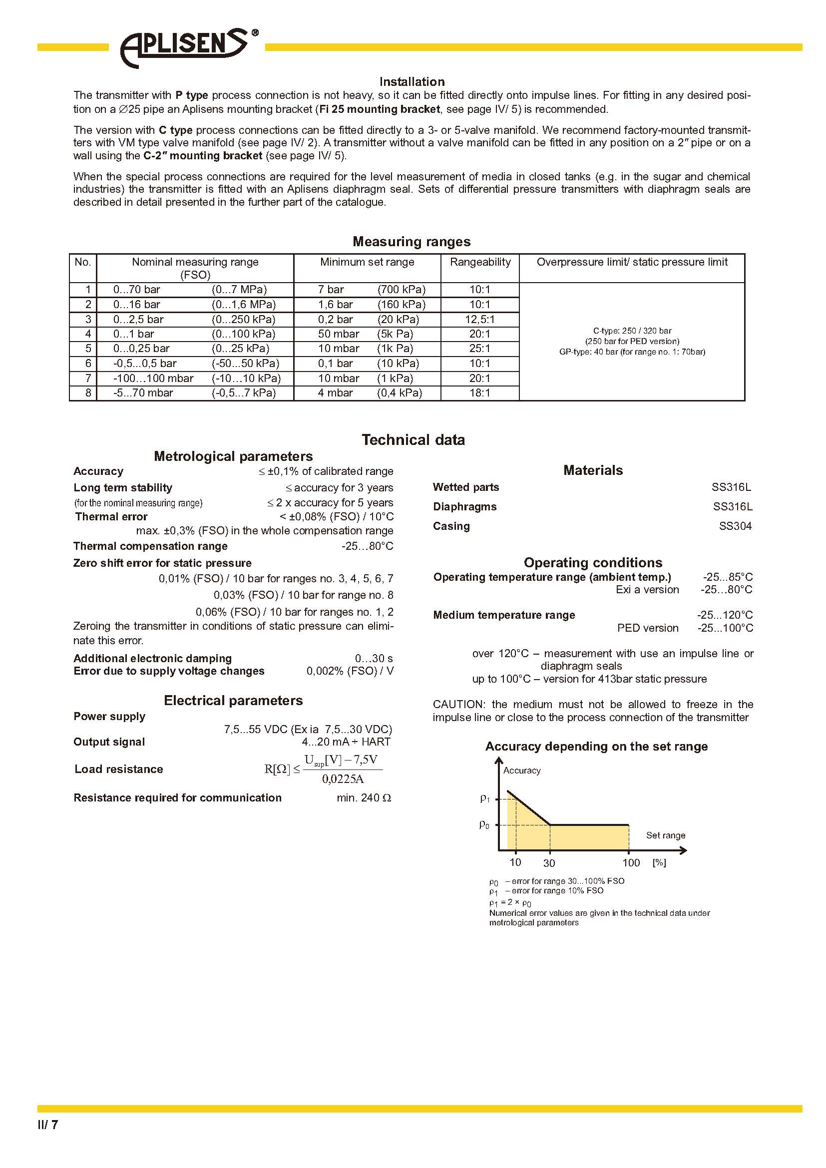 4…20 mA 輸出信號 + HART 協議ATEX 本質安全靜壓極限高達 320 bar準確度 0.1%接液部件材料 316L