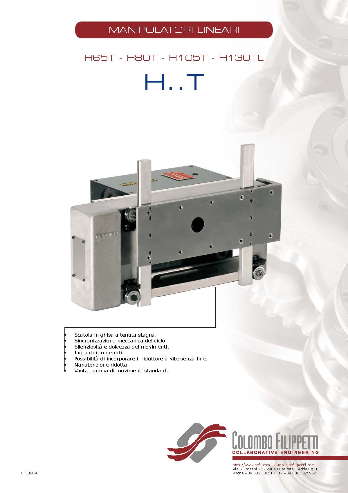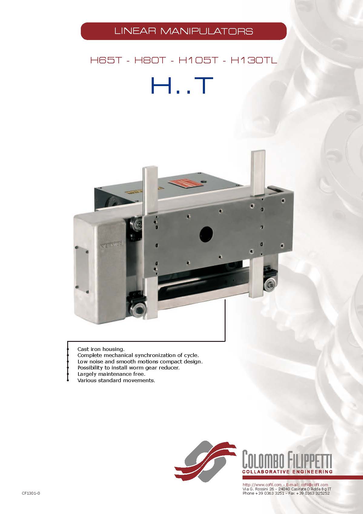 COLOMBO FILIPPETTI spa 的 H.. T 系列線性機(jī)械手是共軛雙凸輪機(jī)構(gòu),可將均勻的輸入旋轉(zhuǎn)運(yùn)動(dòng)轉(zhuǎn)換為典型的“門柱”拾放運(yùn)動(dòng)的同步相位 2 軸正交線性運(yùn)動(dòng)。