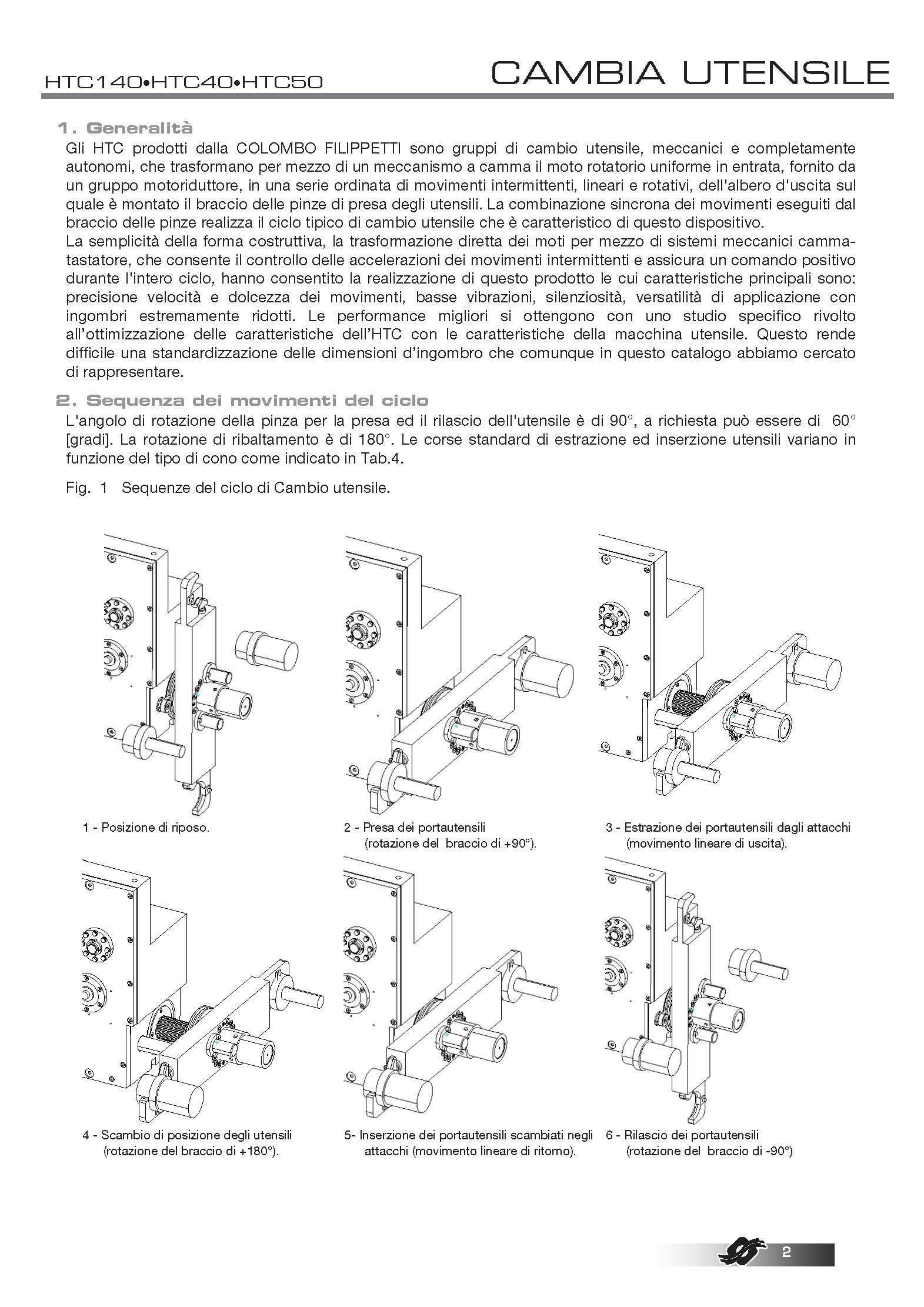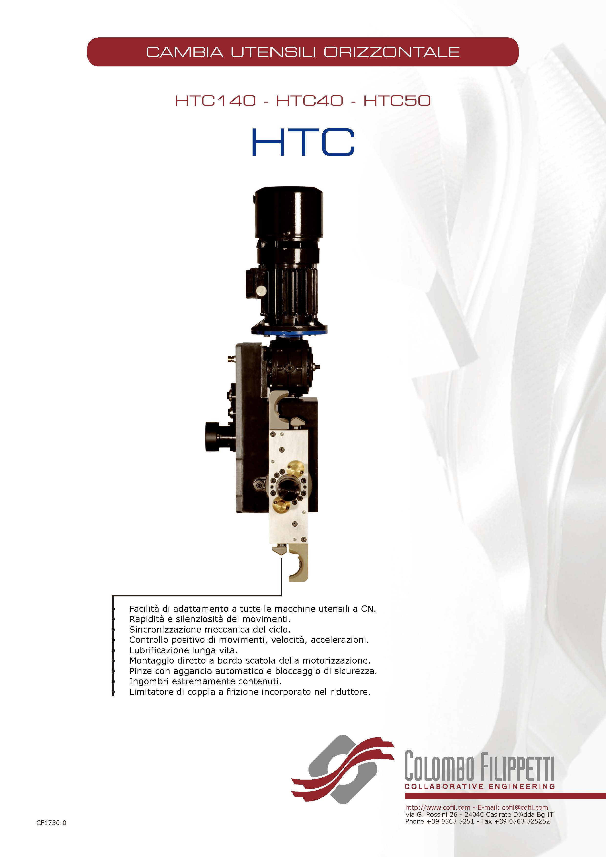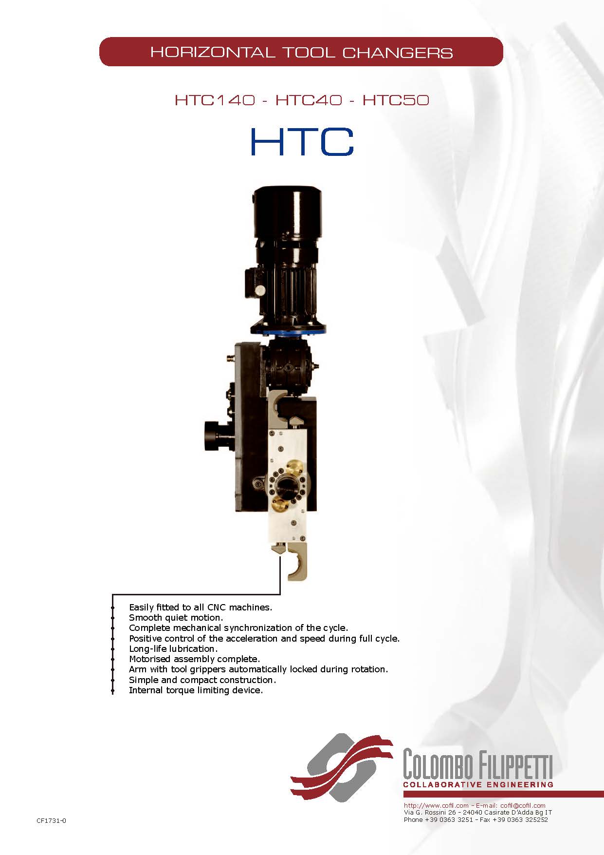 COLOMBO FILIPPETTI spa 的 HTC(臥式換刀裝置)是機械式且完全自主的換刀裝置,它通過凸輪機構(gòu)將齒輪電機裝置提供的均勻傳入旋轉(zhuǎn)運動轉(zhuǎn)換為一系列有序的間歇線性輸出軸的旋轉(zhuǎn)運動,工具夾具的臂鍵鎖在輸出軸上。
